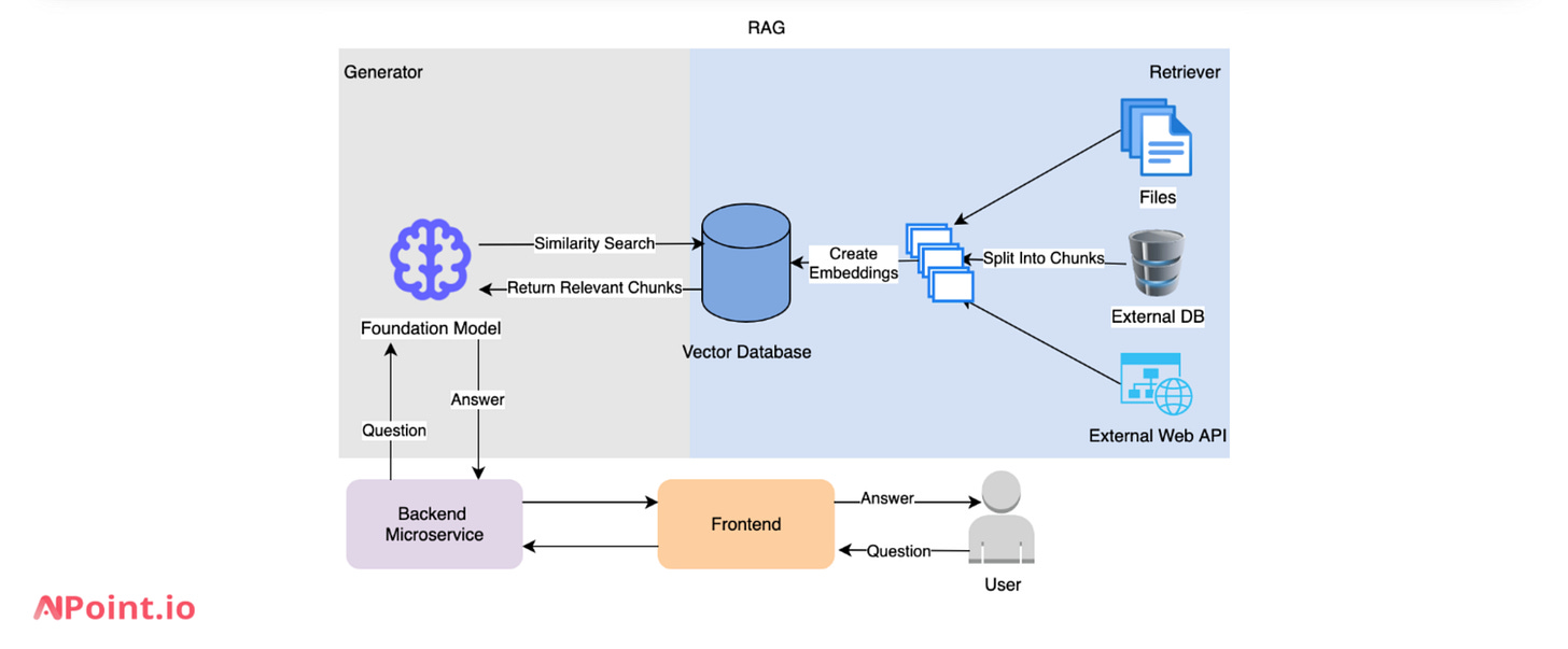 RAG takes a different approach. Instead of relying only on pre-trained knowledge, it dynamically fetches information from external data sources. RAG architecture is based on a retriever and a generator. Here’s how RAG works: