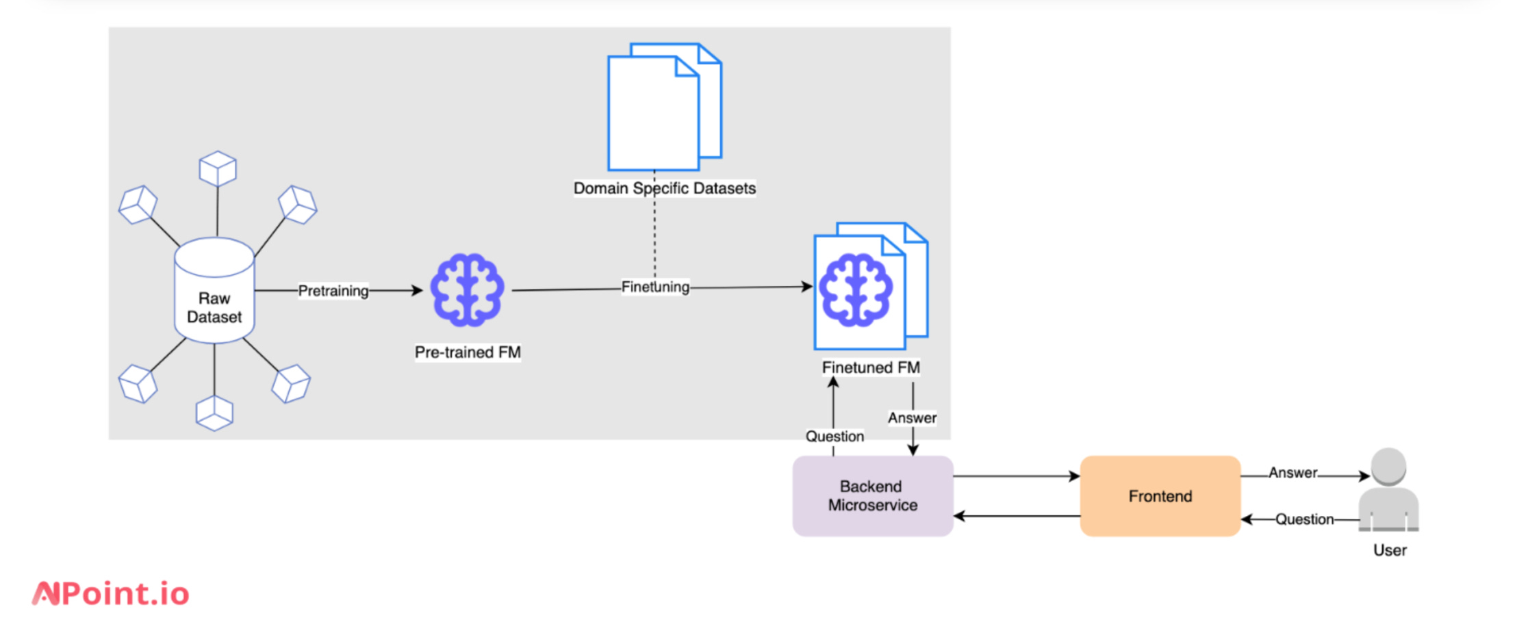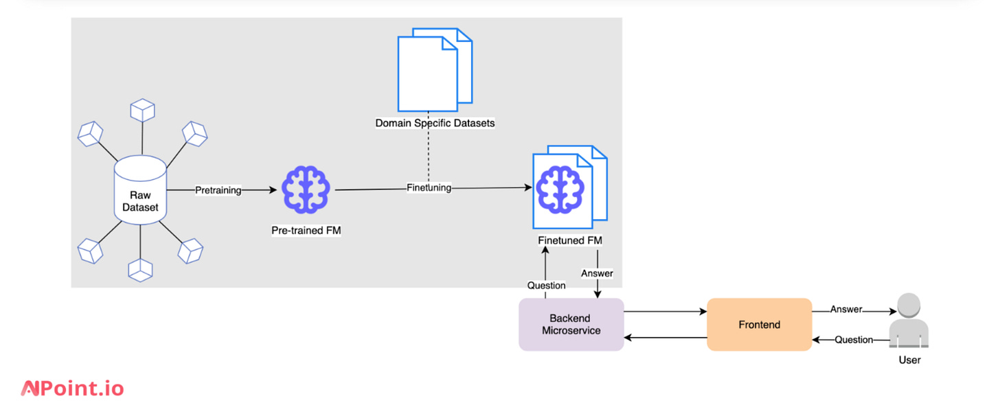 Fine-tuning involves training an existing LLM with domain-specific datasets. For example, a legal chatbot might be fine-tuned using legal documents, allowing the chatbot to provide accurate, context-aware responses to legal inquiries. The following diagram demonstrate how fine tuning can be implemented for an AI Chatbot.