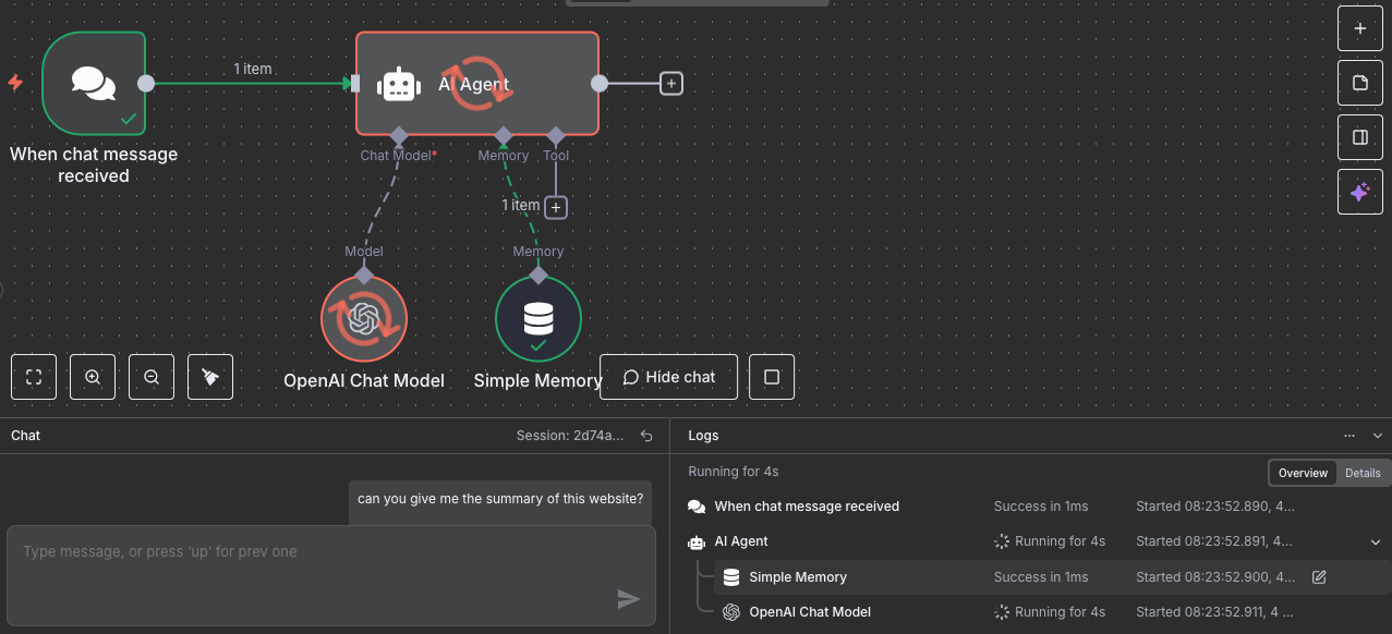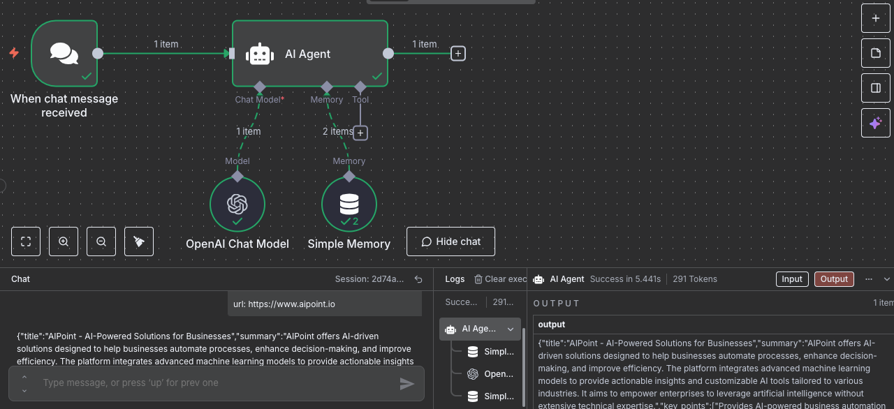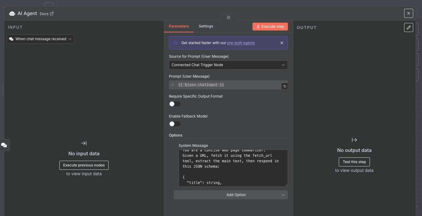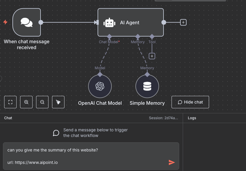 I will start with the simplest example: Create an AI agent that receives a URL in chat and scrapes the data from the website, then sends a summary of that.