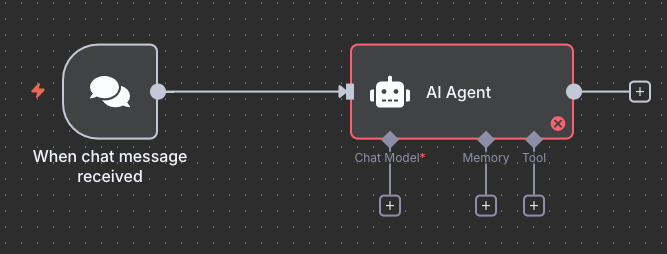 First, create an n8n account (if you don’t already have one), then create a new workflow. In the new workflow, click on the + and type AI Agent on the right-hand side and drag the AI Agent to the page.