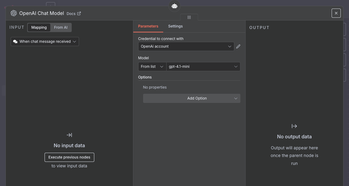 Now it’s time to add memory and an AI model to your AI Agent. First, choose an AI model and memory from the list of nodes and set up your credentials.