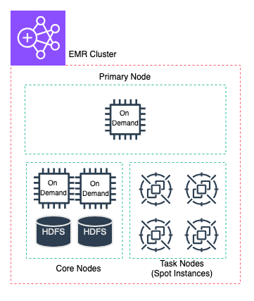 Every EMR cluster includes at least one primary node, and for multi-node clusters, core nodes are necessary, with task nodes added as needed.
